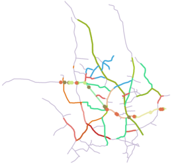 动态分段结束后事件表中的事件被定位到空间上,生成相应的点或者线图层。其中点事件对应生成点数据集,线事件表对应生成的线数据为路由数据集。生成空间数据后可以与原始路由数据(或原始线数据)叠加显示,或者制作专题图显示,并叠加于原始路由之上。图2展现了动态分段生成矢量点和线 (路由)数据后,根据其某一属性制作专题图,并叠加于原始路由之上的效果。其中淡紫色的线是原始路由数据。